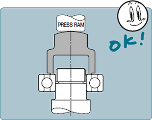 ★ Монтаж подшипников с помощью молотка может привести к повреждениям из-за резких ударов. Для монтажа подшипников с прессовой посадкой используйте прессовую оправку или другое приспособление, обеспечивающее ровную поверхность.