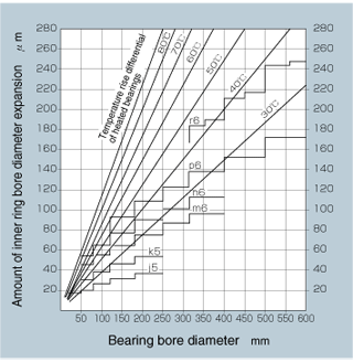 - Температура, до которой следует нагреть внутреннее кольцо, зависит от величины натяга, то есть от диаметра посадочных поверхностей. Для определения необходимой температуры воспользуйтесь следующим графиком.